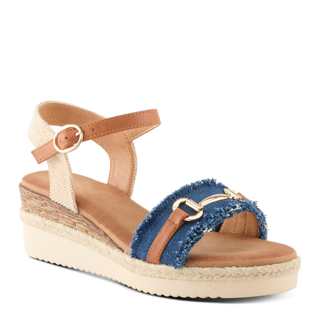Elevate your style with the Lemire platform wedge sandal, featuring a charming toe strap band on a structured wedge heel. Choose between denim or woven textile for the upper, accented by contrasted faux leather detail. The exquisite ankle strap combines faux leather with two-tone canvas material. The wedge showcases faux cork detailing and braided rope around the midsole, all on an off-white platform. Enjoy comfort with a low pitch and soft cushioning footbed.