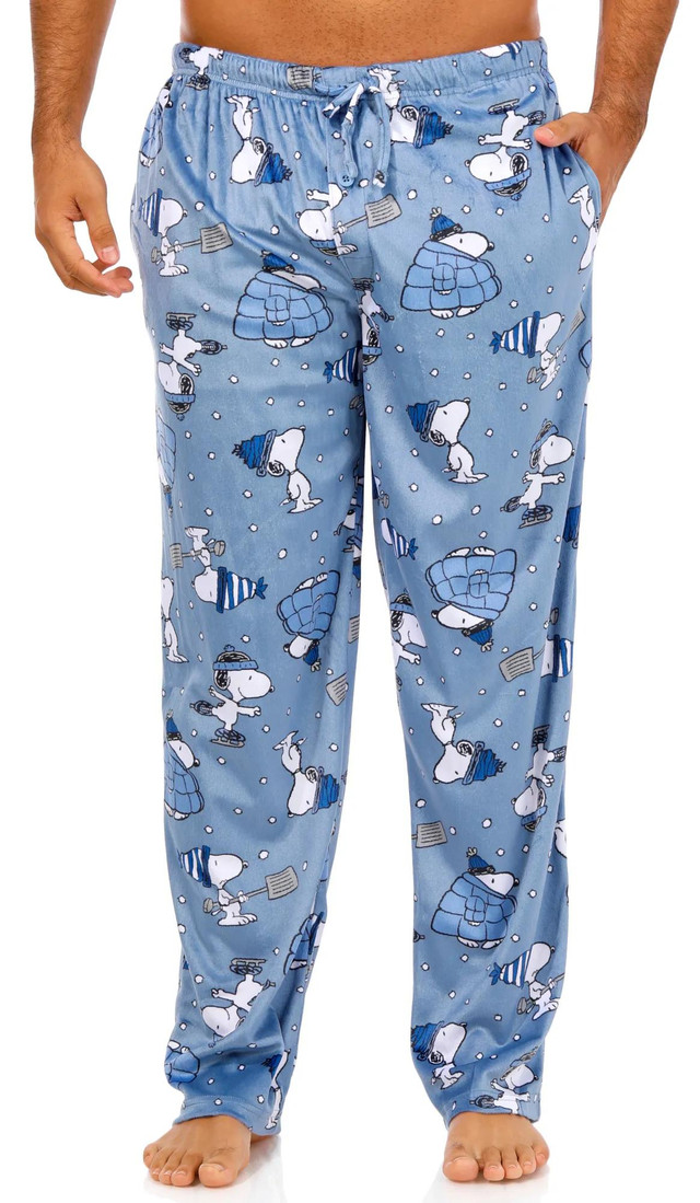 These mens pajama pants offer cozy comfort and festive holiday cheer. Made from ultra soft fabric, they feature an elastic waist with drawstring, side seam pockets, and a heartwarming print of Snoopy enjoying winter fun, perfect for relaxing and creating joyful seasonal moments at home. Fabrication is 100% polyester.