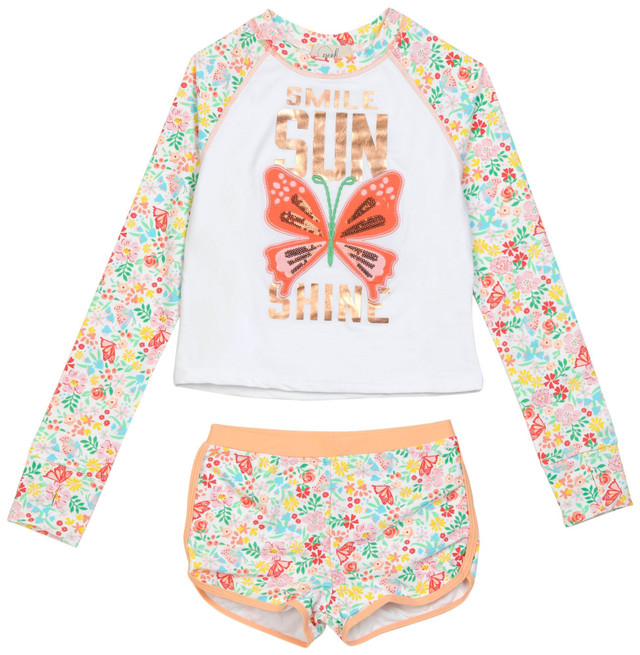 Keep your little one stylish and protected with the Girls' 2 Pc Floral Butterfly Rashguard Set. Made from a blend of nylon and elastane, this set offers a comfortable and flexible fit. The long sleeve rashguard features a charming sequin butterfly and floral graphic design, paired perfectly with matching swim bottoms. With UPF 50+ protection, this set ensures excellent sun safety for all her beach or pool adventures. Combining fashion and function, it's a must-have for sunny days!