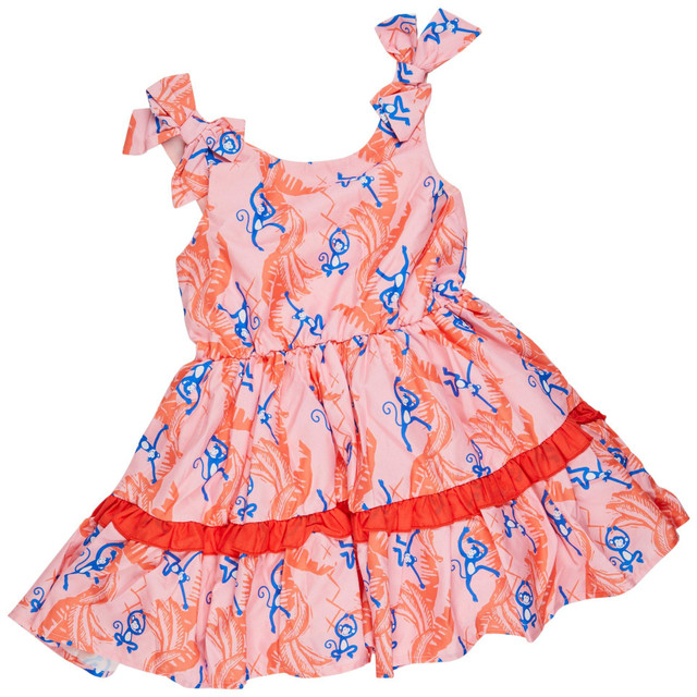 This sleeveless little girls dress is made from 100% cotton and features an adorable monkey print with a playful ruffle skirt. Soft, breathable, and full of charmperfect for warm-weather fun and everyday cuteness.