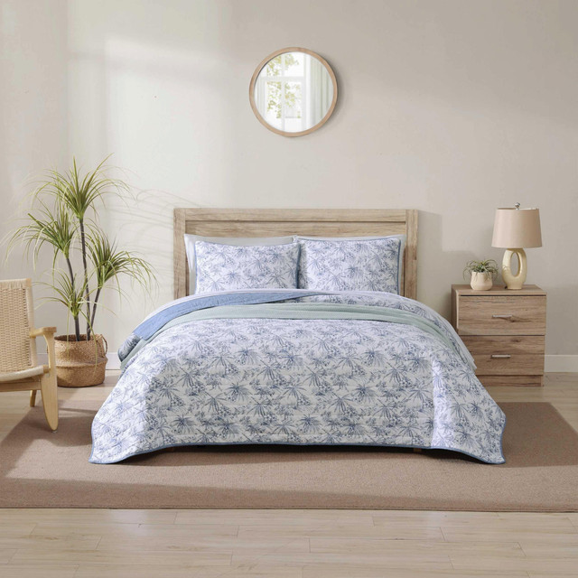 Add a breathable, fresh layer to your bedding ensemble with a coastal inspired Pen and Ink Palm Tommy Bahama quilt. This coastal elements inspired print combines a vibrant essence of color with the serene and calming elements of coastal living. This quilt is 100% cotton, lightweight and easy to layer. The quilt set is fully reversible. Machine washable for easy care.