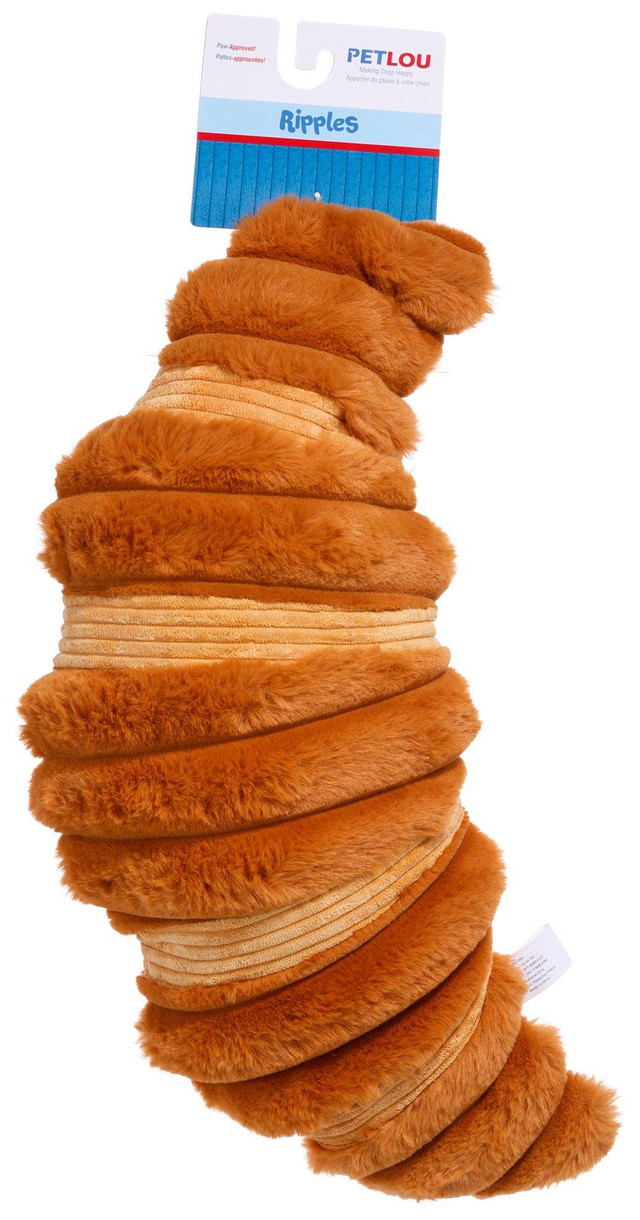 Butter up to playtime with this croissant pet toy! This adorable, plush baked-good is built for excitement, as it contains squeakers and crinkle paper inside. Soft yet durable, its perfect for cuddles or energetic games of fetch. Fabrication is 100% Polyester. Measures approximately 15 in x 8 in x 5 in.