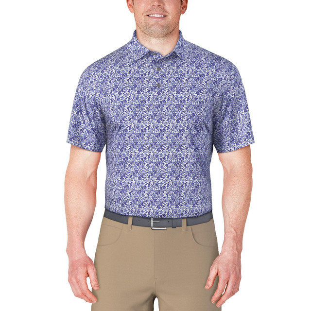 Make a style statement as you step out onto the course in this golf polo shirt. The textured fabric and botanical print add stylish flair to step up your game day style. This golf top includes sun protection for added coverage and stretch shoulder seams so you can swing in comfort. Fabrication is 92% polyester and 8% elastane.