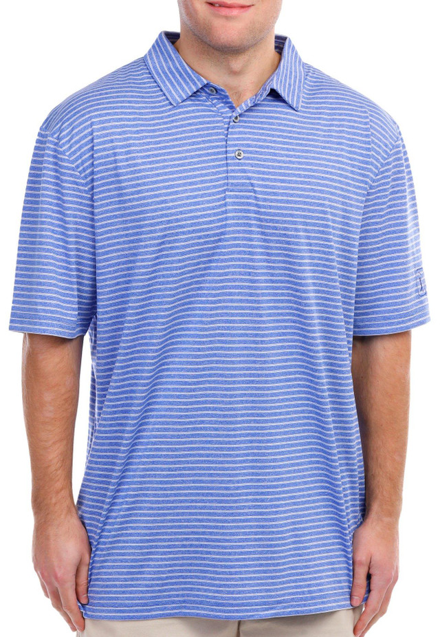 Slim heathered stripes add casual flair to this classic mens golf shirt. Great for both competitive rounds and weekend errands, this versatile mens golf top features moisture wicking to help keep you dry. Sun protection guards against damaging UV rays, while stretch shoulder seams add freedom of movement so you can make each swing without feeling constricted.