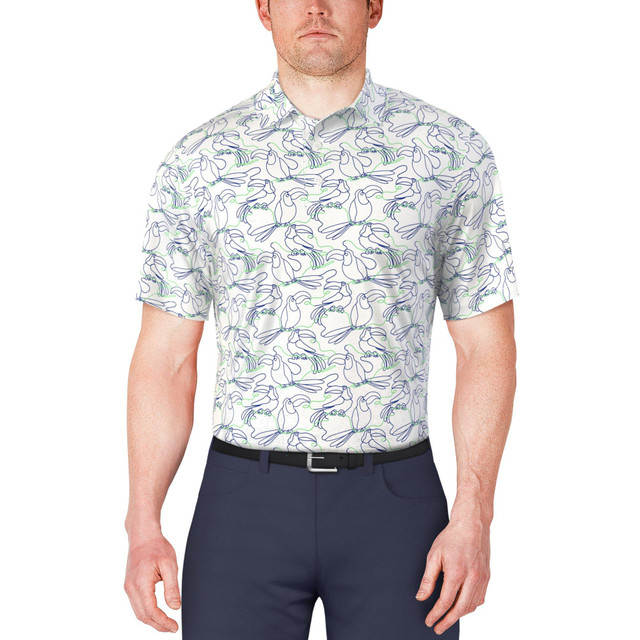 The linear toucan print on this men's golf shirt offers an eye-catching look that's just right for the course. Built for performance as much as style, this golf polo shirt includes stretch shoulder seams and moisture-wicking properties for smooth swinging and a dry feel that lasts through your game. It also includes sun protection to block damaging UV rays. Fabrication is 92% polyester and 8% elastane.