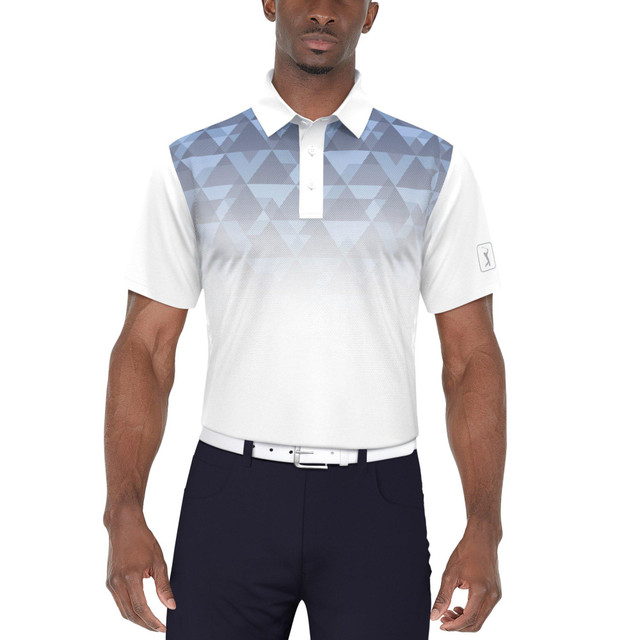 This Men's Short Sleeve Ombre Geo Print Golf Polo features a unique ombre geometric print for a visually striking look. The stretch shoulder seams allow for a comfortable and unrestricted swing, while built-in sun protection safeguards your skin from harmful UV rays. Fabrication is 92% polyester and 8% elastane.