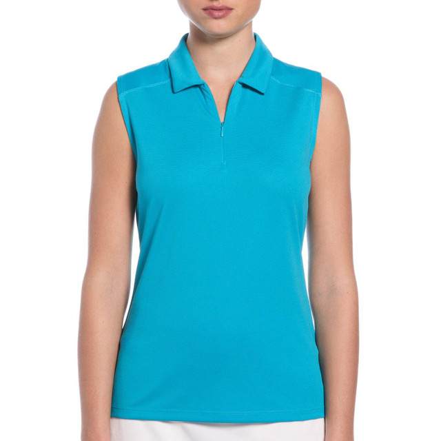 This sleeveless polo features a solid color design on lightweight Airflux ventilated stretch knit fabric, a v-neckline, a spread collar, moisture-wicking technology to keep you feeling cool and dry, and UPF 50 sun protection. The top length measures approximately 24 in. Fabrication 100% polyester.
