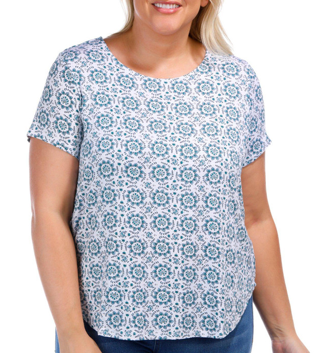 Add a touch of classic style to your wardrobe with this Short Sleeve Top. Featuring a stylish print and a comfortable round neck, this top is perfect for any casual occasion. Made from soft, breathable fabric, it ensures all-day comfort and ease. Whether paired with jeans or shorts, this versatile piece offers a chic and effortless look. Fabrication is 96% rayon, 4% spandex. Top length measures approximately 27 in.