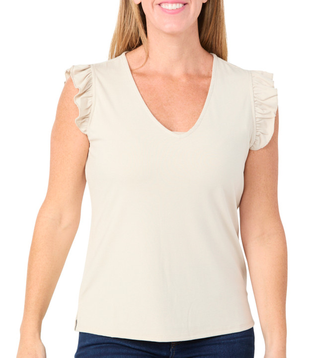Refined simplicity defines the Womens Flutter Sleeve V-Neck Solid Top. Designed with soft flutter sleeves and a flattering V-neckline, it offers a polished yet feminine silhouette ideal for layering or standalone wear. The slight stretch in the fabric enhances comfort and ease of movement throughout the day. Fabrication is 91% rayon 9% spandex. Length measures approximately 24 in.