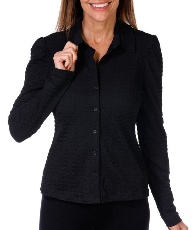 Tailored and stylish the Womens Long Sleeve Textured Knit Button Down Top features a fitted silhouette in a textured solid fabric. Perfect for layering or wearing on its own for a polished look. Fabrication is 95% polyester 5% spandex. Length measures approximately 23 in.