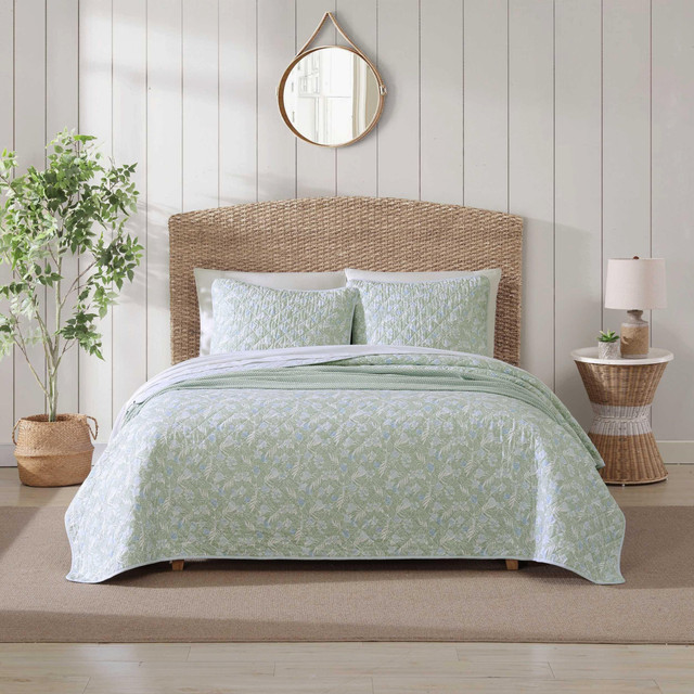 Add a breathable, fresh layer to your bedding ensemble with a coastal inspired Pineapple Bloom Tommy Bahama quilt. This coastal elements inspired print combines a vibrant essence of color with the serene and calming elements of coastal living. This quilt is 100% cotton, lightweight and easy to layer. The quilt set is fully reversible. Machine washable for easy care.