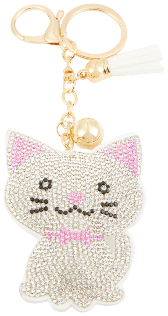Add a playful sparkle to your accessories with the Pink Ear Cat Bag Charm. Featuring a rhinestone-studded exterior, adorable cat design with pink ears, and a gold lobster clasp, this 3-inch charm is a purr-fect accent for bags or keychains.