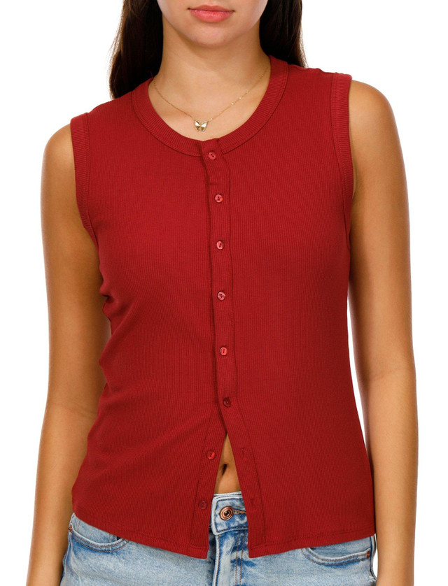 Keep it classic with this Juniors Sleeveless Button Down Top, featuring a crew neckline, ribbed exterior, and solid color. A versatile piece that is perfect for layering or wearing solo. Fabrication 95% rayon, 55 spandex