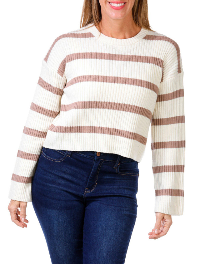 Keep it cozy and cute with the Juniors Striped Crew Neck Sweater. Featuring a ribbed texture and classic crew neckline, this striped knit adds a pop of pattern to your everyday look. Soft, stylish, and easy to layer, perfect for cooler days and casual outings.