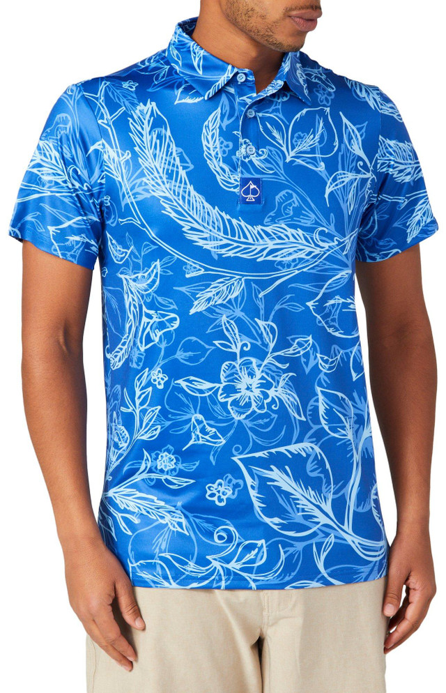 Upgrade your golf wardrobe with our Men's Cabo Golf Polo Shirt. Featuring an ocean inspired print, this shirt has a button-down collared neckline and short sleeves. Enjoy UPF 45 sun protection, moisture-wicking, and wrinkle resistance for a comfortable and stylish day on the course.