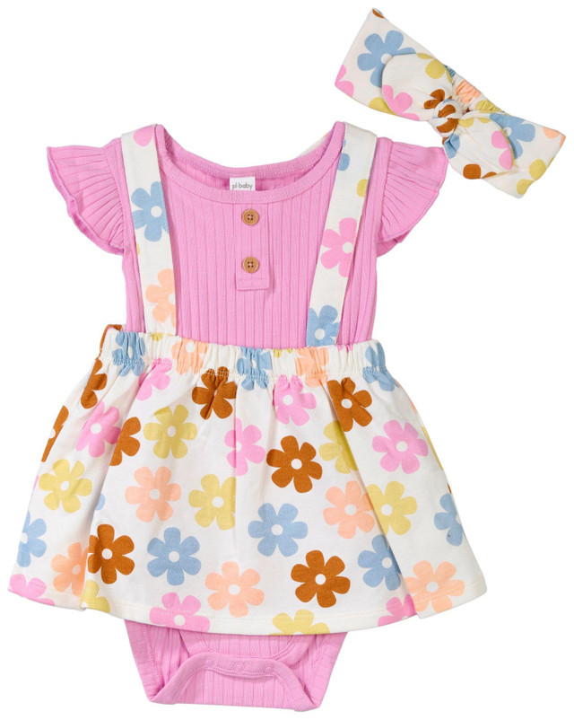 This charming three-piece outfit set for little girls includes a flutter sleeve romper made from soft, breathable fabric, designed with a convenient snap closure at the bottom for easy diaper changes. Paired with a stylish suspender skirt featuring adjustable overall-style straps, the look is both playful and classic. A matching headband completes the ensemble, adding a sweet finishing touch perfect for everyday wear or special occasions.