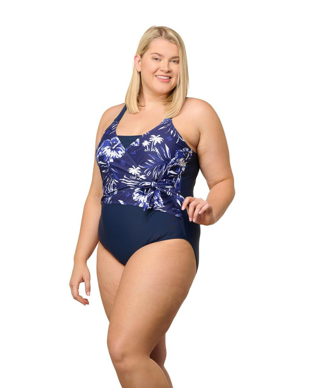 Elevate your swimwear collection with this chic one-piece swimsuit, featuring a faux wrap front styling and adjustable straps for a perfect fit. The stylish hibiscus design adds a touch of tropical flair, making it ideal for beach, pool, or resort wear. The tie front detail enhances its fashion-forward appeal, ensuring you look effortlessly stylish wherever you go. Dive into summer with confidence and elegance in this must-have swimsuit.