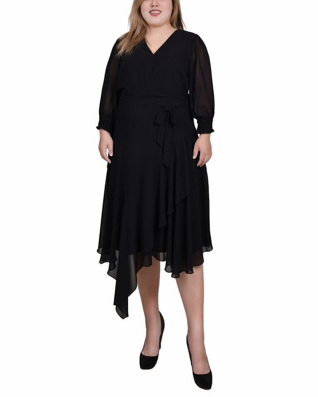 Plus 3/4 Sleeve Belted Chiffon Hankerchief Hem Dress