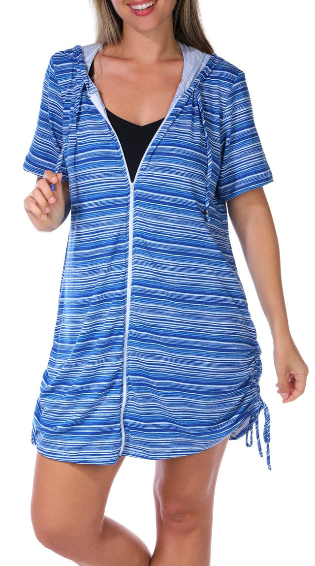 Stay cool and stylish in this Cover Up Hoodie, designed with a zipped front and adjustable cinched sides for a customizable fit. The lightweight fabric and striped print add a laid back vibe, making it the perfect layer for beach days, boardwalk strolls, or post swim lounging. Fabrication is 95% polyester, 5% spandex.