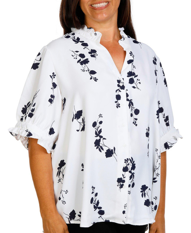 This plus size top features a chic floral print with a button down front closure. Short sleeves with ruffle hems and a ruffle detail on the collar add a soft feminine touch, making it a lovely choice for any casual or dressy occasion. Fabrication 100% polyester
