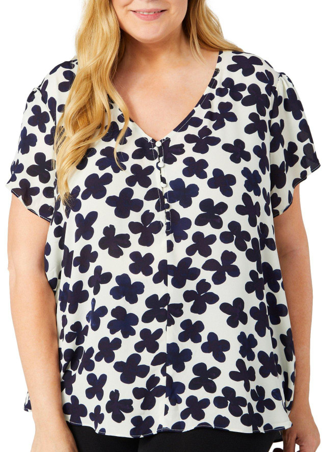 Add a touch of elegance to your wardrobe with the Plus Short Ruffle Sleeve Floral Top. Made from 100% polyester, this top features a charming floral design and a flattering v-neckline. The short ruffle sleeves add a playful touch, while the 27-inch length ensures a comfortable fit. Perfect for any occasion, this top pairs beautifully with jeans or skirts for a stylish and versatile look.