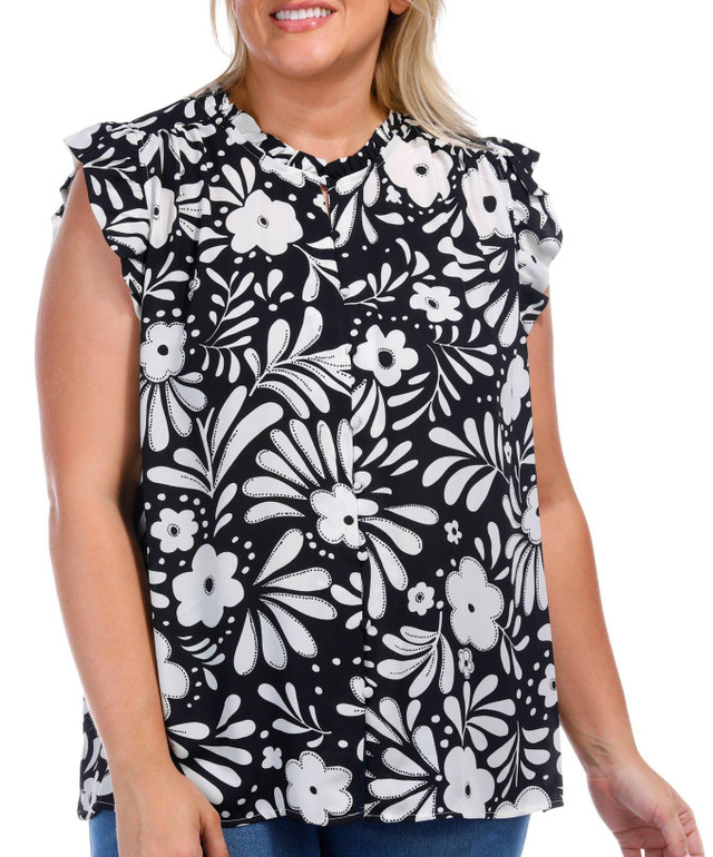 Stand out in a crowd with this Plus Cap Sleeve Floral Ruffle Top. Pair with a pant or skirt for a perfectly put together look for going out, or with jeans for a night out. Fabrication is Self: 100% Nylon, Lining: 95% Polyester, 5% Spandex. Top length measures approximately 27 in.