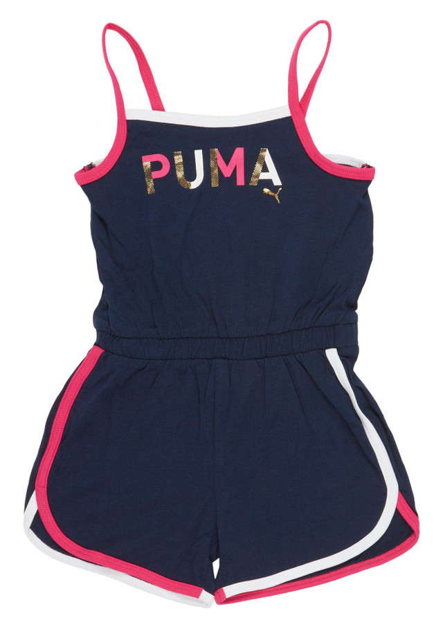 This sporty-chic Puma romper is a must-have for active little trendsetters! Featuring stylish spaghetti straps and a retro gym short silhouette, its designed for both comfort and movement. The iconic Puma logo on the chest in a bold design adds a sporty edge, while the pink and blue trim at the bottom gives it a fun, vintage vibe. Perfect for playdates, summer outings, or just lounging in stylethis romper is ready for adventure!