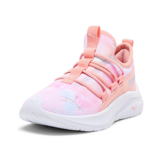 Discover the Puma One4All Painted Clouds slip-on sneaker, a stylish pair that features a comfortable textile upper, elastic laces for easy wear, and a cushioned footbed. Perfect for active little ones, they combine bold design with everyday comfort.