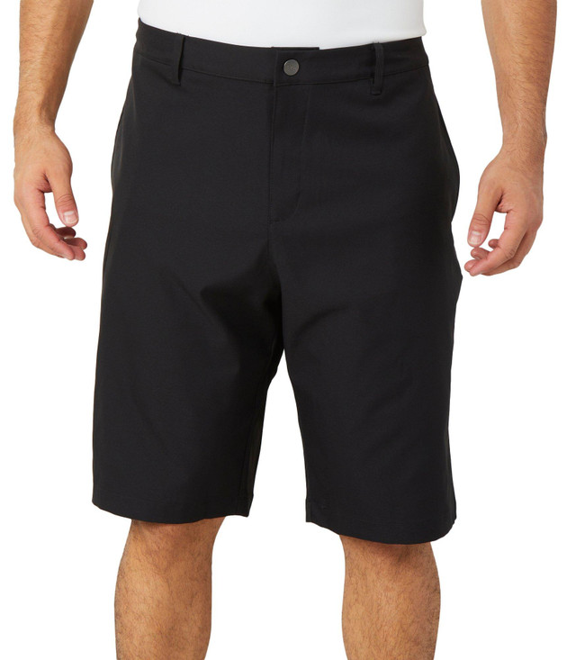 These mens golf shorts feature a stretch waistband for a comfortable fit and a solid color design for classic style. Built with sun protection, they are perfect for the golf course, outdoor activities, or casual warm weather wear. Inseam is approximately 11 in. Fabrication is 100% polyester.