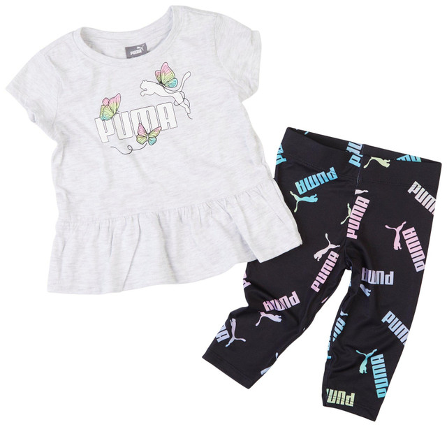 This Puma active set blends sporty style with a playful twist. The black leggings feature a bold rainbow logo, while the grey top showcases the iconic Puma panther with colorful butterfly accents. A dress-like flair, adding a fun and fashionable touch. Designed for comfort and movement, this set is perfect for active days, keeping her stylish and ready for adventure.