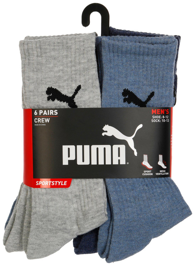 Elevate your sock game with these Men's 1/2 Terry Crew sportstyle Socks. The pack includes 6 pairs of socks of solid colors that will complement any outfit. These socks are not only soft but also durable. Featuring a cushioned design, these socks will keep your feet comfortable all day long. Shoe Size: 8-12, Sock Size: 10-13. Fabrication is 94% Polyester, 4% Rubber, 2% Spandex.
