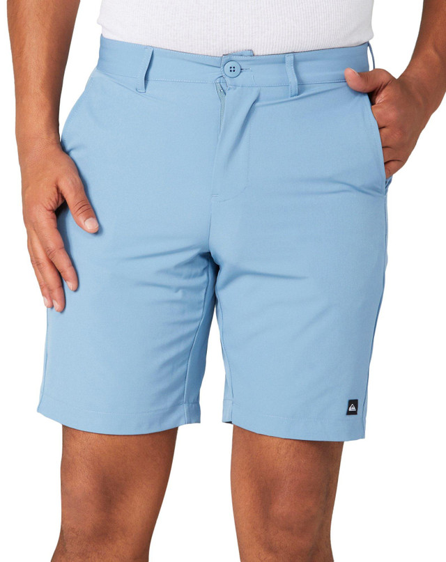 These union amphibian surf shorts feature anti-rash free stretch fabric, solid color design for easy matching, one button thru back pocket, one zip closure back pocket, hyper dry fast drying time, button-fly and zip closure, and regular fit. Outseam measures approximately 21 inches above the knee. Fabrication is 92% polyester, 8% elastane.