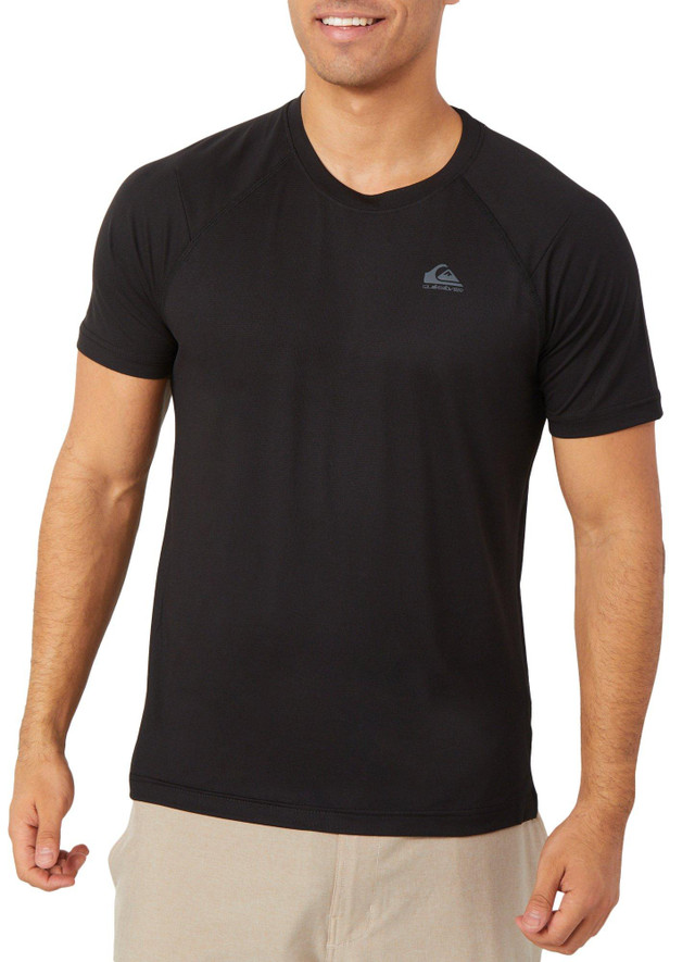 This mens short sleeve performance shirt features a crew neck and soft stretchy fabric for all day comfort. The solid color design offers a clean versatile look, making this shirt ideal for workouts, outdoor activities, or casual wear while providing ease of movement and a comfortable fit. Fabrication is 92% polyester and 8% spandex.