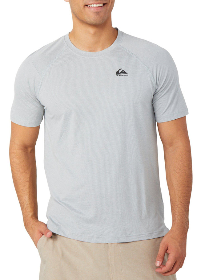 This mens short sleeve performance shirt features a crew neck and soft stretchy fabric for all day comfort. The solid color design offers a clean versatile look, making this shirt ideal for workouts, outdoor activities, or casual wear while providing ease of movement and a comfortable fit. Fabrication is 92% polyester and 8% spandex.