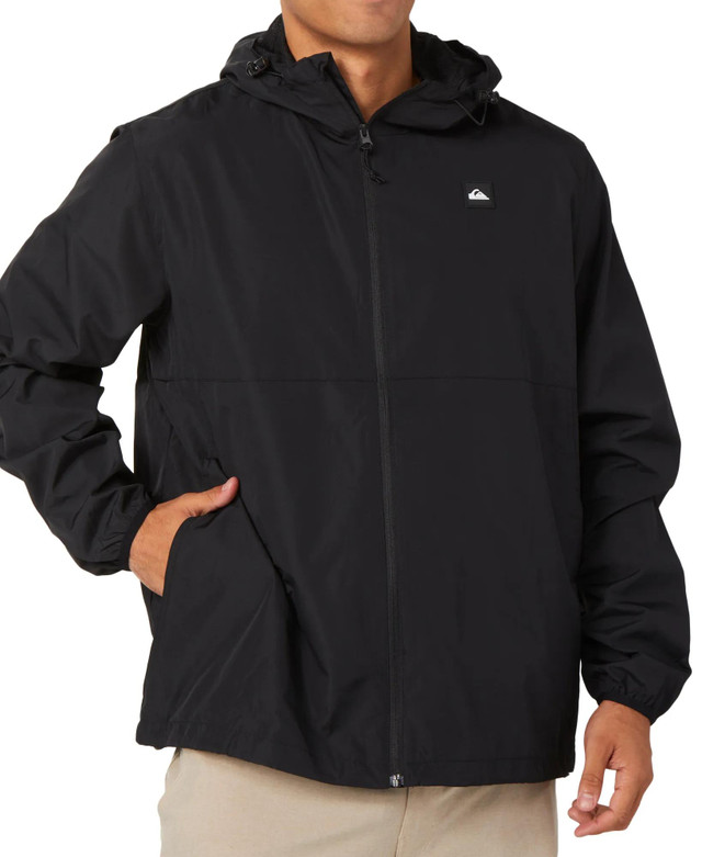 This mens windbreaker jacket features a full zipper, side pockets, and a hood with drawstring for adjustable coverage. The solid color design offers a sleek versatile look, making this jacket ideal for outdoor activities, casual wear, or layering in changing weather. Fabrication is 100% polyester.