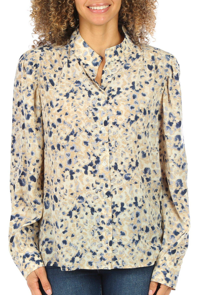 Add a new accent to your favorite outfits with this stylish abstract animal-print button-down top! It features a vibrant print pattern, long sleeves with button cuffs, a button down front, and soft fabric. Top length measures approximately 23 in.