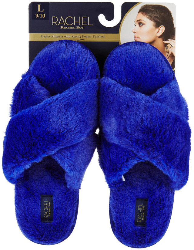 The Cardi Plush Crossband Slippers combines style with high quality comfort for a pair of slippers you'll never want to take off. This open toe pair has a spring foam insole and is covered in plush, faux fur fabric in a criss-cross design that allows for foot freedom while you look great!
