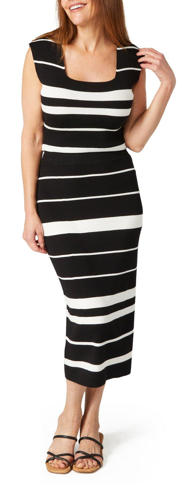 Embrace effortless style with the Knit Sleeveless Top. Featuring a chic striped pattern, this top is perfect for warm weather and layering. The soft, breathable knit fabric ensures comfort throughout the day, while the sleeveless design offers a modern, relaxed fit. Pair it with your favorite jeans, skirts, or shorts for a versatile look that transitions seamlessly from casual outings to more polished occasions. Fabrication is 78% rayon, 22% polyester.