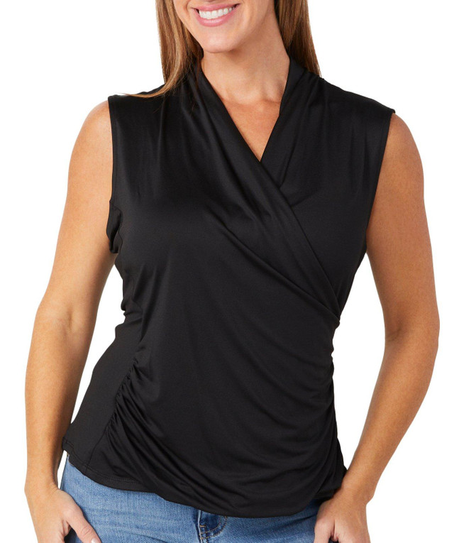 Graceful and refined, this sleeveless top features a soft, drapey neckline that adds effortless elegance to its solid color design. Perfect for layering or wearing solo, it offers a flattering silhouette and timeless style for both casual and dressy occasions. Fabrication is 95% polyester, 5% spandex.