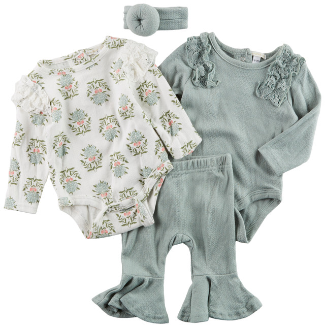 Create effortless style with the Baby Girls 4 Piece Bodysuit Pant Headband Set featuring one solid and one floral long sleeve bodysuit, paired with matching solid pants and a coordinating headband. Ideal for gifting or everyday comfort. Fabrication is 100% cotton.