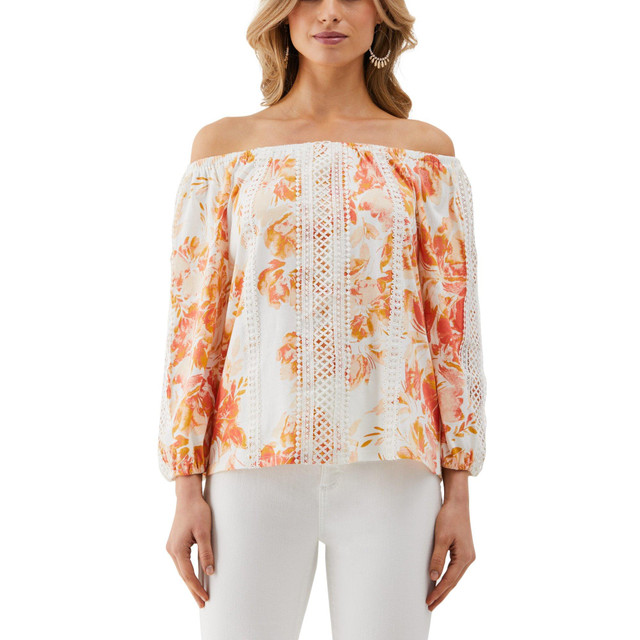 Printed with a lively floral pattern, this womens top features lace trim down the front and see-through lace insets along the sleeves for elegant feminine style. The 3/4 sleeve womens top is crafted from a soft jersey knit fabric thats comfortable to wear in any season or setting. The neckline and sleeves are elasticated, which creates a stylish silhouette and helps provide added comfort.