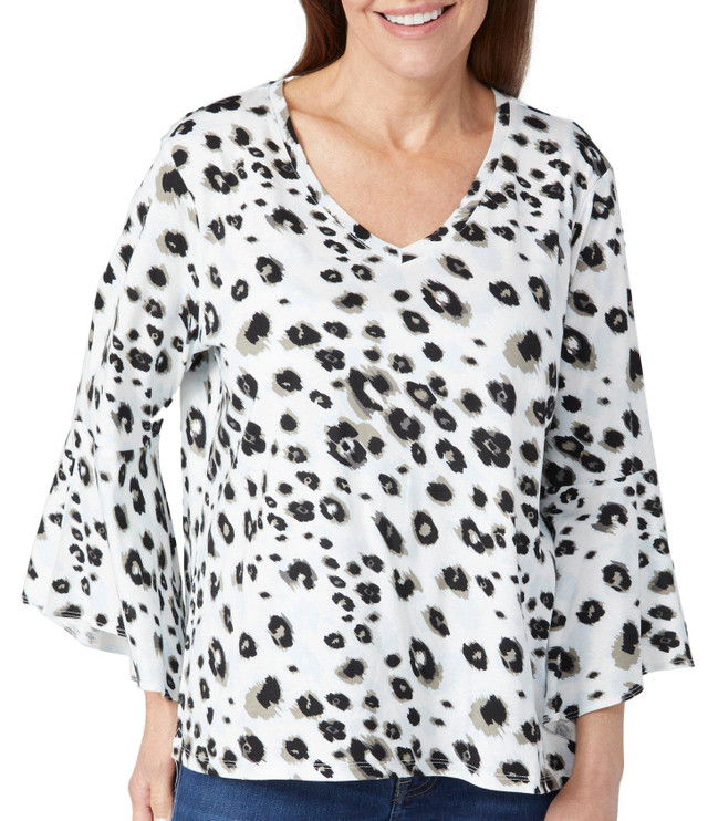 This stylish Long Sleeve Top showcases a bold cheetah print, perfect for making a statement. The ruffled sleeves add a playful touch, while the V-neck design enhances its feminine appeal. Ideal for both casual outings and dressier occasions, this top combines trendy elements with comfort, ensuring you look and feel fabulous wherever you go. Top length measures approximately 24 in. Fabrication is 60% cotton, 40% modal.