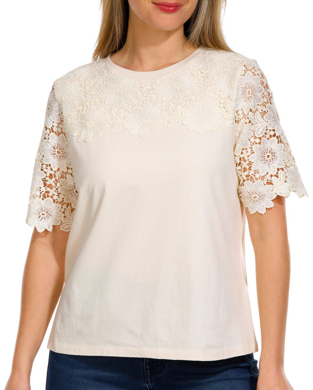 Add a touch of elegance to your collection with our Short Sleeve Top, featuring exquisite crochet yoke and sleeve details. This top combines comfort with a delicate, handcrafted look, making it perfect for any occasion. Whether you're dressing up for a special event or keeping it casual, this versatile piece will ensure you stand out with its unique charm and timeless style. Body fabrication 100% cotton. Lace fabrication 100% polyester.