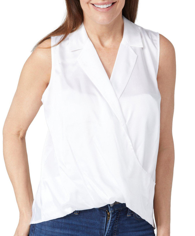 This Sleeveless Blouse is a chic and stylish addition to any wardrobe. Featuring a cross front detail, this blouse offers a unique and fashionable touch. The single button neck adds a sophisticated and elegant element, making it perfect for both casual and dressy occasions.