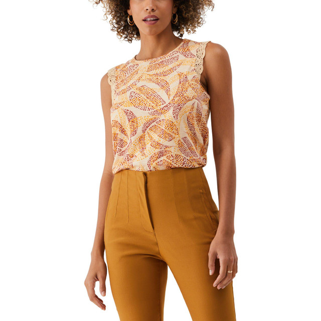 Stay cool and stylish in this petite sleeveless printed lace trim top. Designed for a flattering fit, it features a classic neckline and lightweight fabric, perfect for layering or wearing on its own. A must-have basic for any warm-weather wardrobe. Pair with jeans, capris or your favorite skort!