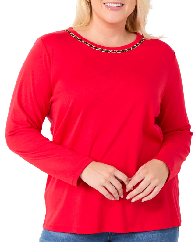 When it comes to this women's top, style is all about the details. Designed to elevate your everyday looks, this long sleeve top features a polyurethane chain at the neckline for a decorative and unique finishing touch. Fabrication is 100% cotton.