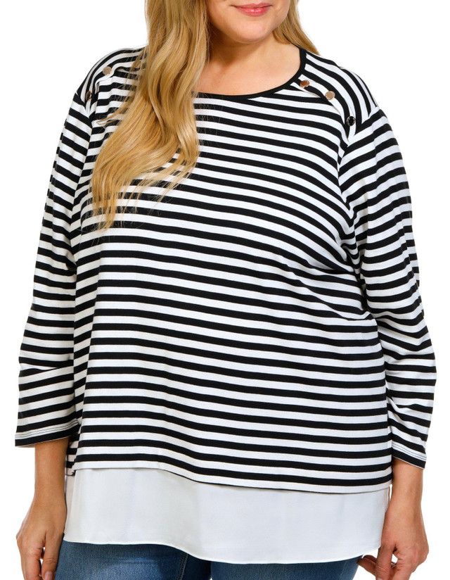 Introducing our Plus Long Sleeve Striped Top, crafted from 100% cotton. This stylish top features a classic striped print, button accents on the shoulders, a boat neckline, long sleeves, and a unique 2Fer hem. Perfect for any occasion, it offers a comfortable fit and a touch of elegance to your wardrobe.