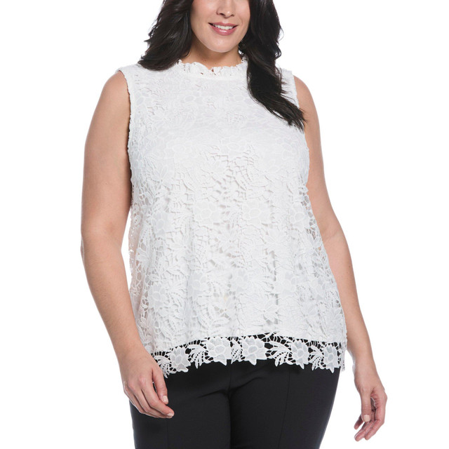 Give your outfit a feminine touch with this Plus Size Rafaella® women's top, which features a chic and sophisticated lace fabric. Whether you're in the office or on a night out, this scalloped lace women's top makes a statement.