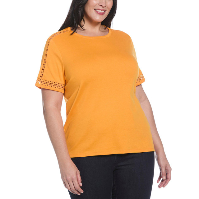 A versatile short sleeve top that can be dressed up or down for any occasion, this Plus Size Rafaella® design features elegant dot lace inserts along the shoulders and sleeve openings. The ladies tee is made from breathable cotton fabric, with ribbing for a timeless textured look. The classic fit is flattering without clinging too tight, for all-day comfort.