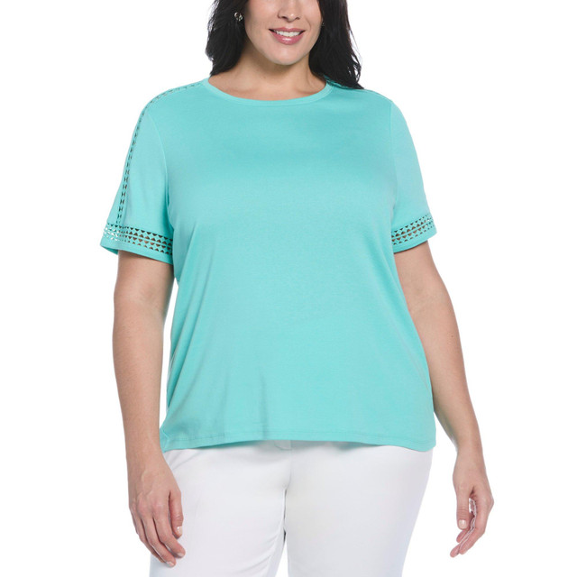A versatile short sleeve top that can be dressed up or down for any occasion, this Plus Size Rafaella® design features elegant dot lace inserts along the shoulders and sleeve openings. The ladies tee is made from breathable cotton fabric, with ribbing for a timeless textured look. The classic fit is flattering without clinging too tight, for all-day comfort.